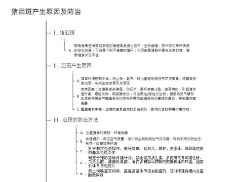 环境因素猪舍通风不良导致氨气、硫化氢等有害气体浓度过高,刺激眼部黏膜,引发慢性结膜炎或呼吸道疾病,从而分泌过多泪液形成泪斑。冬季为保暖封闭门窗时尤为常见。