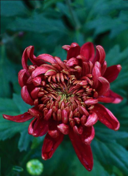 重瓣红色菊花,花期10月中旬,通过远缘杂交培育而成。