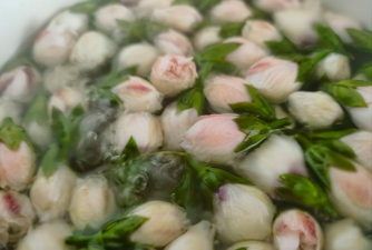 金银花干燥花蕾可泡茶或炒菜,具有抗菌、抗病毒作用,常用于清热解毒。