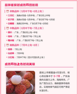 荔枝通常在5~8月份成熟,但也因其品种的不同而有所差异。荔枝的品种较多,共分为:早熟品种、中熟品种和晚熟品种。早熟品种的荔枝有三月红这一代表性品种,三月红一般在3月份下旬就已成熟,也是大众日常所见最多的一种荔枝。中熟品种有圆枝、黑叶等品种;晚熟品种有挂绿、淮枝、桂味、兰竹等品种。