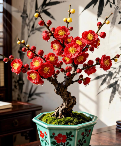 五针松叶片成簇,冬季开花时点缀绿意,需保持土壤微湿,避免积水。