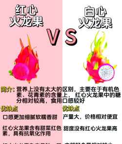 1、果肉颜色不同:红心火龙果果肉颜色是红色;白心火龙果果肉颜色是白色。2、品种不同:红心火龙果是国家杂交出来的品种;白心火龙果是国外的品种。3、价格不同:红心火龙果价格在10~11元一斤;白心火龙果价格在8元一斤。4、口感不同:红心火龙果含糖量较高,口感更甜;白心火龙果含糖量低,口感一般。