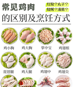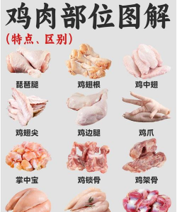 鸡胸肉:胸部肌肉,脂肪含量低,常用于健身餐或切片烹饪。