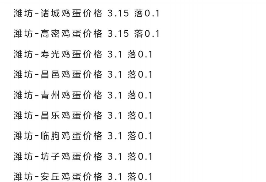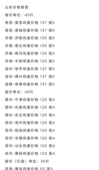 小码鸡蛋:2.75-2.85元/斤备注:部分蛋商报价显示,44-46斤规格的精品鸡蛋价格跌至2.65元/斤,30-37斤规格跌至2.70元/斤。