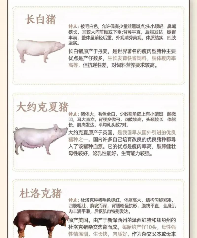 规模化养殖:优先选长白、杜洛克或杂交种猪(如长荣海波尔),注重饲料效率和瘦肉率。
