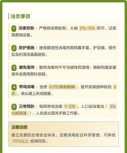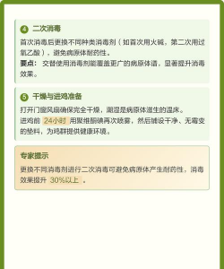频率:雏鸡舍每日1次,成年鸡舍隔天或每周2-3次;活疫苗接种后24小时内禁止消毒。