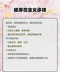 彼岸花,学名为红花石蒜(Lycoris radiata),在中国文化中具有丰富的象征意义。以下是彼岸花的主要象征含义: