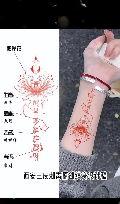 颜色选择红色:最常见,象征热情、爱情和生命力。白色:纯洁、神圣,适合表达纯洁的爱情或对逝去亲人的怀念。黄色:温暖、阳光,适合表达积极向上的态度。搭配元素蝴蝶:象征自由与灵魂的飞升。骷髅:增加神秘感,强调生死的主题。文字:可以加上一些有意义的文字,如“永远的爱”、“勿忘我”等。位置选择手臂:显眼且容易展示。背部:适合大面积的设计,可以展现更多的细节。小腿:适合小巧精致的图案。四、彼岸花纹身的文化背景