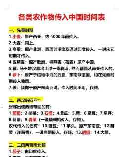 以下是一些主要农作物被引入中国的时间列表,这些农作物在不同历史时期对中国的农业和饮食文化产生了深远的影响。