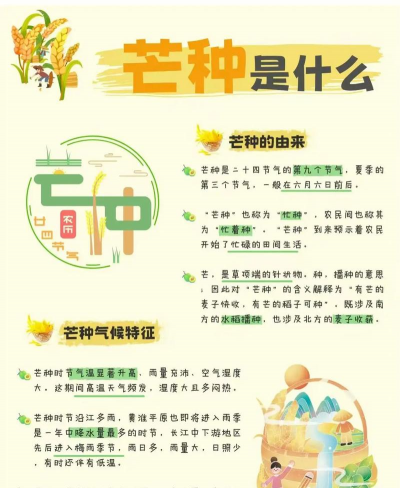适宜种植:继续晚稻育秧,种植西瓜、甜瓜等。农事活动:进行第二次中耕除草。9. 芒种