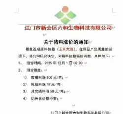 饲料企业调价:因原料成本压力,多家饲料企业在2025年上调产品价格,涨幅达50-300元/吨,直接导致养殖端成本增加。