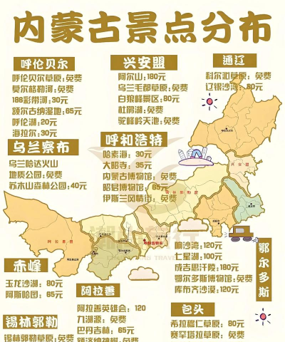 呼伦贝尔大草原地理位置:位于内蒙古自治区东北部,是世界著名的三大草原之一。特色:被誉为“中国最美的草原”,拥有广阔的草地、湖泊和河流,是观赏草原风光的绝佳地点。活动:骑马、射箭、体验蒙古族文化。锡林郭勒大草原地理位置:位于内蒙古自治区中部,