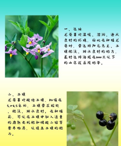 土壤要求:龙葵对土壤适应性广,但以肥沃、疏松、排水良好的弱酸性砂壤土为佳,pH值5.5~6.5最适宜。避免低洼或过黏的土壤,易引发根腐病。