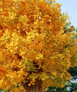 黄树叶像翩跹的蝴蝶,随风飞舞时宛如一群金黄的蝶群。