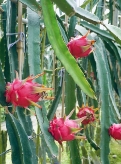 茎叶:火龙果植株为攀援性多肉植物,茎干深绿色、三棱柱状,边缘波浪形,无主根但具大量气生根,可攀附生长。叶片已退化,光合作用由茎干完成。