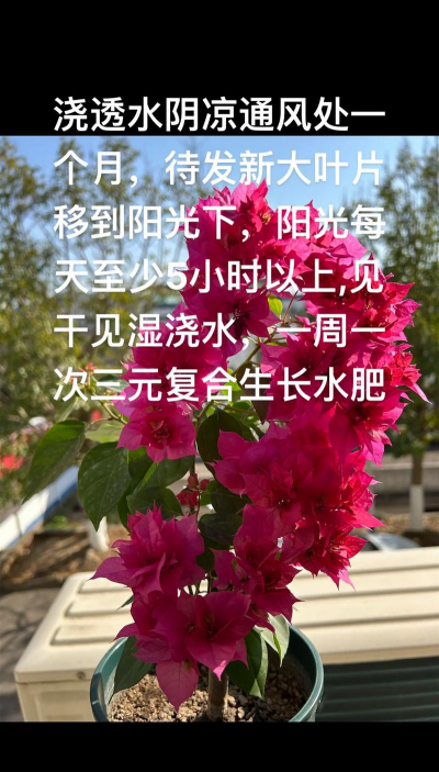 三角梅喜光,缓苗后需逐渐增加至每天6-8小时直射光(夏季中午适当遮阴),光照不足易导致徒长或不开花。