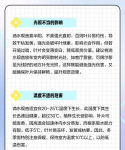 低温冻伤:滴水观音为热带植物,冬季气温低于15℃易受冻,叶片发黄下垂。