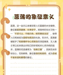 总结 :菖蒲的寓意多元,既承载了爱情、婚姻的文化寄托,又体现了文人的精神追求,同时兼具实用价值与审美意义,是中华传统文化中富有内涵的植物象征。