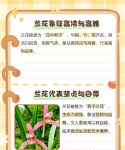 兰花被誉为“花中君子”,象征高洁、清雅、坚贞不渝的品质,常被用来比喻有才学、品德高尚的人。