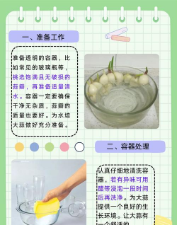容器选择:浅盘、透明玻璃瓶或塑料瓶均可,容器不宜过深,高度与蒜瓣相近即可。使用前需清洗消毒。