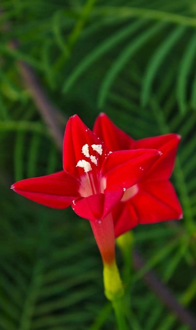 形态:茎细长光滑,可达4-6米,羽状复叶裂成丝状,花冠高脚碟状,呈红色、白色或粉红色,形似五角星,花期6-10月。