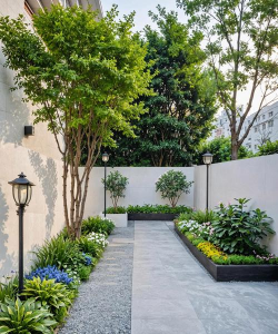 层次搭配:结合乔灌木、地被植物和藤本(如紫藤、爬山虎)营造立体感。