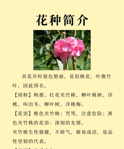 夹竹桃(学名:Nerium oleander 或 Nerium indicum),又名“夹桃竹”“柳叶桃”“半年红”等,是夹竹桃科夹竹桃属的常绿灌木或小乔木。以下是其关键信息的综合整理: