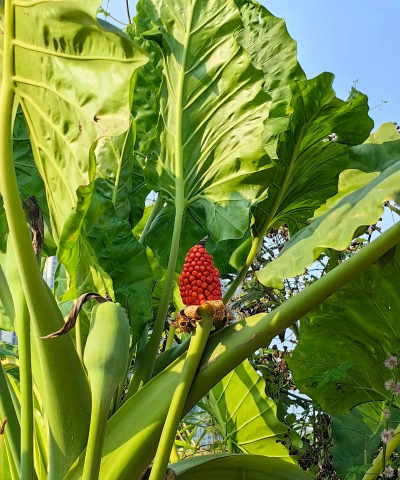 叶柄:粗厚,长可达1.5米,螺旋状排列,颜色为绿色或暗紫色,基部有宽鞘。