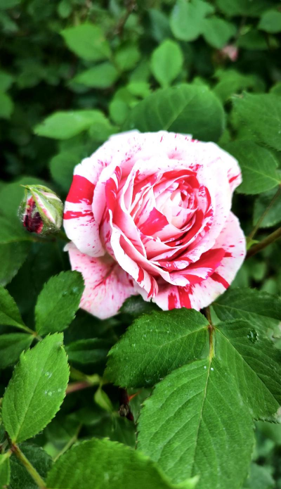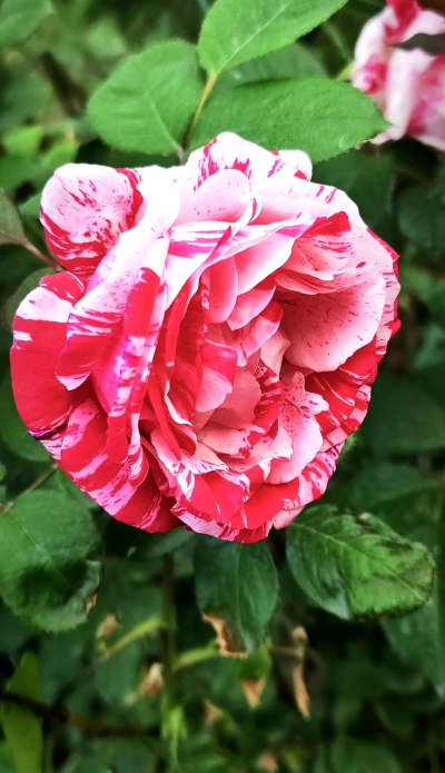 花色为红白复色,花瓣外层为鲜红色,中间花芯为乳白色,花朵大且艳丽,香气浓郁。