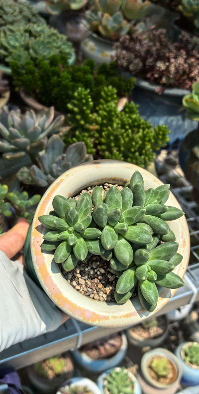叶片圆梭型,先端尖,叶片上有不规则的叶棱,覆薄粉,叶色淡绿,在光照充足、温差加大后,叶色会变成深绿至墨绿,莲座上的叶片也更加紧致密实,千代田之松易群生和木质化。