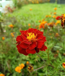由于一串红承受不了“五一”的低温,又经不起“十一”的早霜,盛夏的酷暑可使大多植株呈半死状态。因此,孔雀草已逐步成为花坛、庭院的主体花卉。它的橙色、黄色花极为醒目。