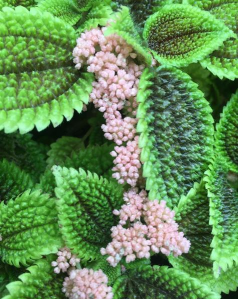 皱叶冷水花是人工培育的品种,是荨麻科、冷水花属植物,叶片呈黄绿色,表面有皱纹,会开出淡粉色的小花。皱叶冷水花全年可栽培,可以将其摆放在书房、客厅、阳台等地,也可以成片栽种于庭院、公园,或者是作为行道绿植。