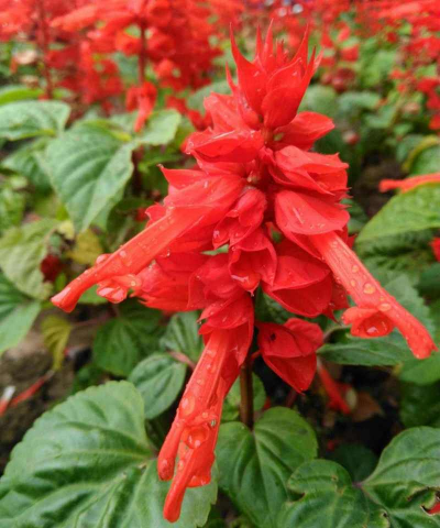 一串红是唇形科、鼠尾草属植物,花序修长、颜色艳丽,花期较长,是很好的观花植物。一串红叶片呈卵圆形或三角状卵圆形,边缘具锯齿,花冠呈红色,适宜种植在庭院中。一串红喜湿润、温暖的环境,生长期需要提供充足的水分,保持土壤湿润。