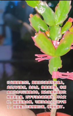 1、时间:选择每年的4~7月最佳。2、选枝:选则健康、多刺的叶仙枝条,在离叶片上方0.5厘米处剪掉树梢,并划一个1厘米深的口。3、嫁接:将蟹爪兰叶子底部的叶肉剪掉,切口要与插穗的宽度一致,将其与叶仙切口对齐,用夹子夹紧固定,3~5天即可取下夹子正常养护。