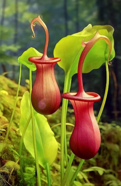 形态特征 :茎部木质或半木质,可长至3米;叶片呈长椭圆形,末端有捕虫笼(笼口边缘有蜜腺分泌蜜液吸引昆虫)。