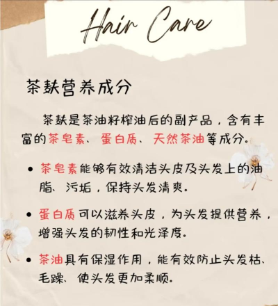 6、用茶籽粉洗头,能去屑止痒、乌发防脱,洗后头发松软亮泽。