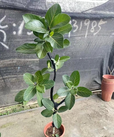 叶:叶互生,薄革质,狭椭圆形,长4-8厘米,宽3-4厘米,表面深绿色,有光泽,全缘,基部楔形。