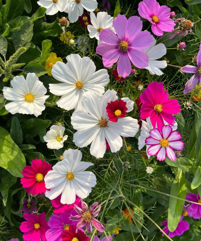 株型:高大舒展,适合群植形成花海,微风下摇曳如“仙女起舞”。典型场景:成片种植时,纤细的茎顶着色彩明艳的花朵,远看如繁星点缀,近观则花瓣层次分明,与黄色花心形成鲜明对比。