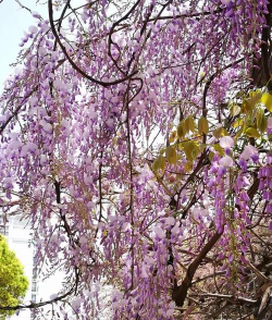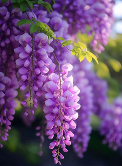 白居易《陈家紫藤花下赠周判官》“藤花无次第,万朵一时开。”形容紫藤花同时盛放的壮观,如瀑布倾泻。
