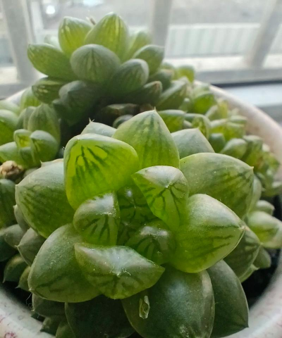 叶片呈莲座状排列,顶端有透明或半透明的“窗”,表面有深色纵线条。