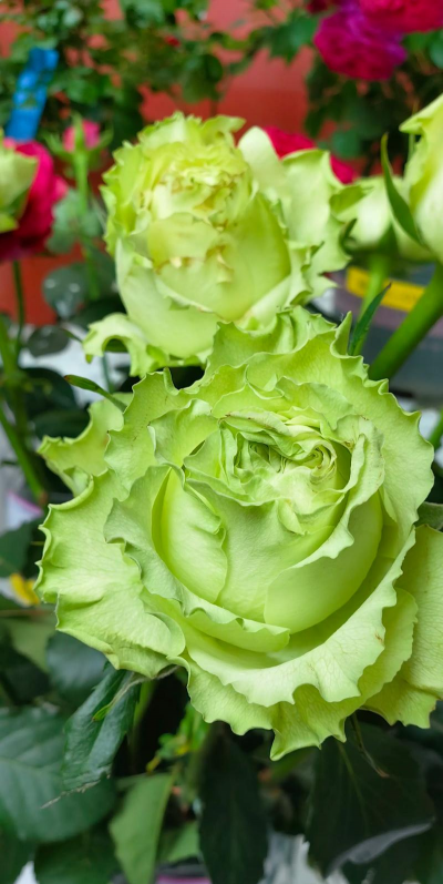 绿玫瑰自然品种如“绿萼”或转基因培育的绿玫瑰,花瓣呈豆绿色,边缘可能带白或淡黄。传统品种“绿星”由中国培育,花色特异且耐开。