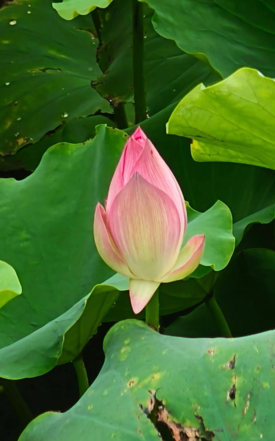 形态:荷花根茎肥厚(即藕),横生于水底泥中;叶片盾状圆形,直径25-90厘米,表面深绿色,背面灰绿色,被蜡质白粉覆盖;花朵单生于花梗顶端,直径10-20厘米,花瓣多数,嵌生在花托穴内,花色丰富,包括白、粉、红、黄及复色等。
