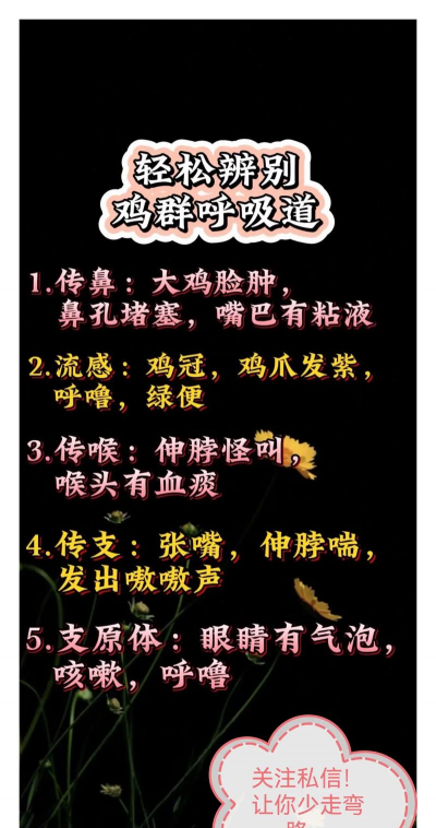 病鸡:咳嗽、打喷嚏、呼吸急促或有呼噜声,可能为支原体病、传染性喉气管炎或新城疫。