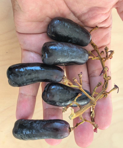长的葡萄叫美人指,果粒呈细长型,颜色为紫红色,表皮有光泽,外观非常漂亮,是日本植原葡萄研究所培育出来的二倍体欧亚种。美人指葡萄需肥量较大,尤其在生长发育期,要特别重视花前的追肥,如果花前追肥不足,导致树体营养不够,会有严重影响果实的生长发育,对产量造成影响,施肥以硫酸钾等纯钾肥为主。