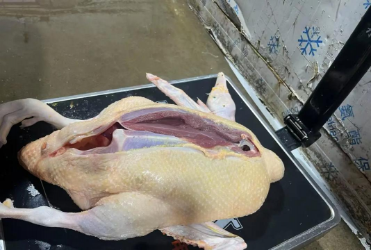 拿1个大碗,放入100g温水和适量精盐,把鸭的2只翅膀并起,然后用右手捏住鸭嘴巴,脖颈向上弯,把然后用刀在鸭脖处切1小口,将血滴在碗中,断滴至鸭子停止抖动,就可下锅炉烫毛,水温为61℃时将鸭下锅,64℃就可出锅。