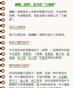 磷酸二氢钾适合长寿花、栀子花、铁线莲、月季花、三角梅、茉莉花等花卉使用。磷酸二氢钾的化学式是KH2PO4,在空气中稳定,溶于水,不溶于乙醇,有潮解性。工业上可以用磷酸二氢钾作缓冲剂、培养剂;也用作细菌培养剂合成清酒的调味剂,制偏磷酸钾的原料,酿造酵母的强化剂、培养剂、发酵助剂、膨松剂。