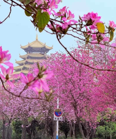 被称为“粉色隧道”,道路两侧紫荆花形成天然拱廊,航拍视角如粉色绸缎贯穿城市。清晨7点前可独享无人花径,适合穿汉服或浅色衣物拍照。