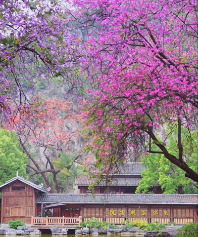 30公里长的紫荆花带与碧水青山相融,可租共享单车穿越“花海+喀斯特峰林”景观,途中打卡凤凰岭大桥(侗族风雨桥造型)。