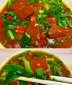 2、锅内放油烧热,爆香葱姜,下猪血,烹料酒、加水,烧沸后,再放豆腐块,最后调味即可。