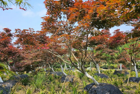 松树、柏树、小叶黄杨:这些常绿植物能提供稳定的深绿色背景,与红枫的红色叶片形成鲜明对比,尤其在秋季色彩更加突出。冬季红枫落叶后,常绿植物仍能维持景观的观赏性。